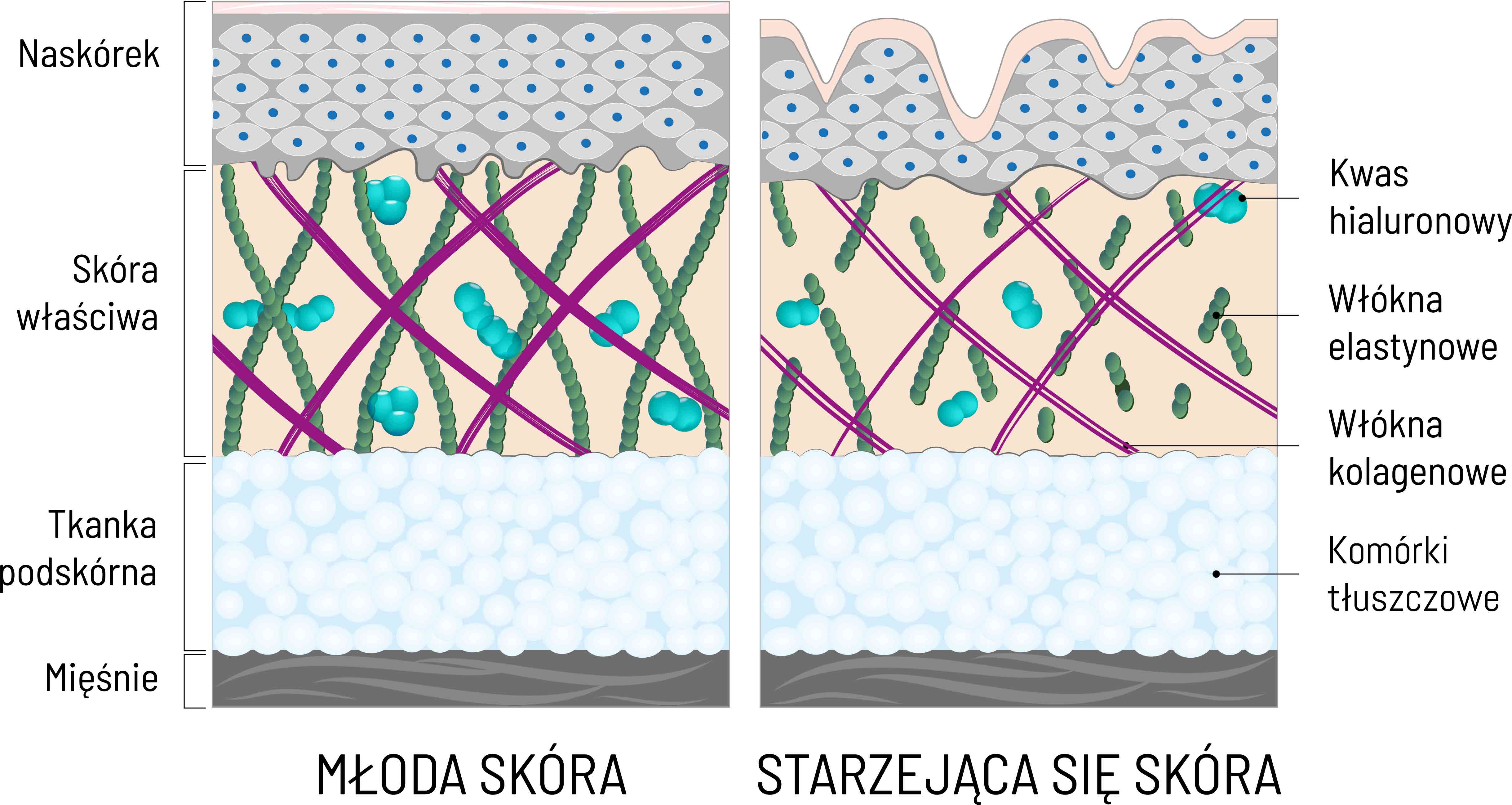 Kolagen to białko występujące naturalnie w organizmie. Młoda skóra może zawierać do 80% kolagenu. Od około 30. roku życia ilość kolagenu w skórze zaczyna spadać o około 1-2% rocznie. Sieć powiązań włókien kolagenowych staje się wtedy słabsza i rzadsza, czego wynikiem jest wiotkość skóry i powstawanie zmarszczek.